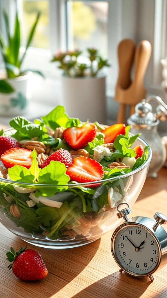 A fresh spring salad with mixed greens, strawberries, walnuts, and a boiled egg provides carbs, protein, and antioxidants to jump‑start metabolism.